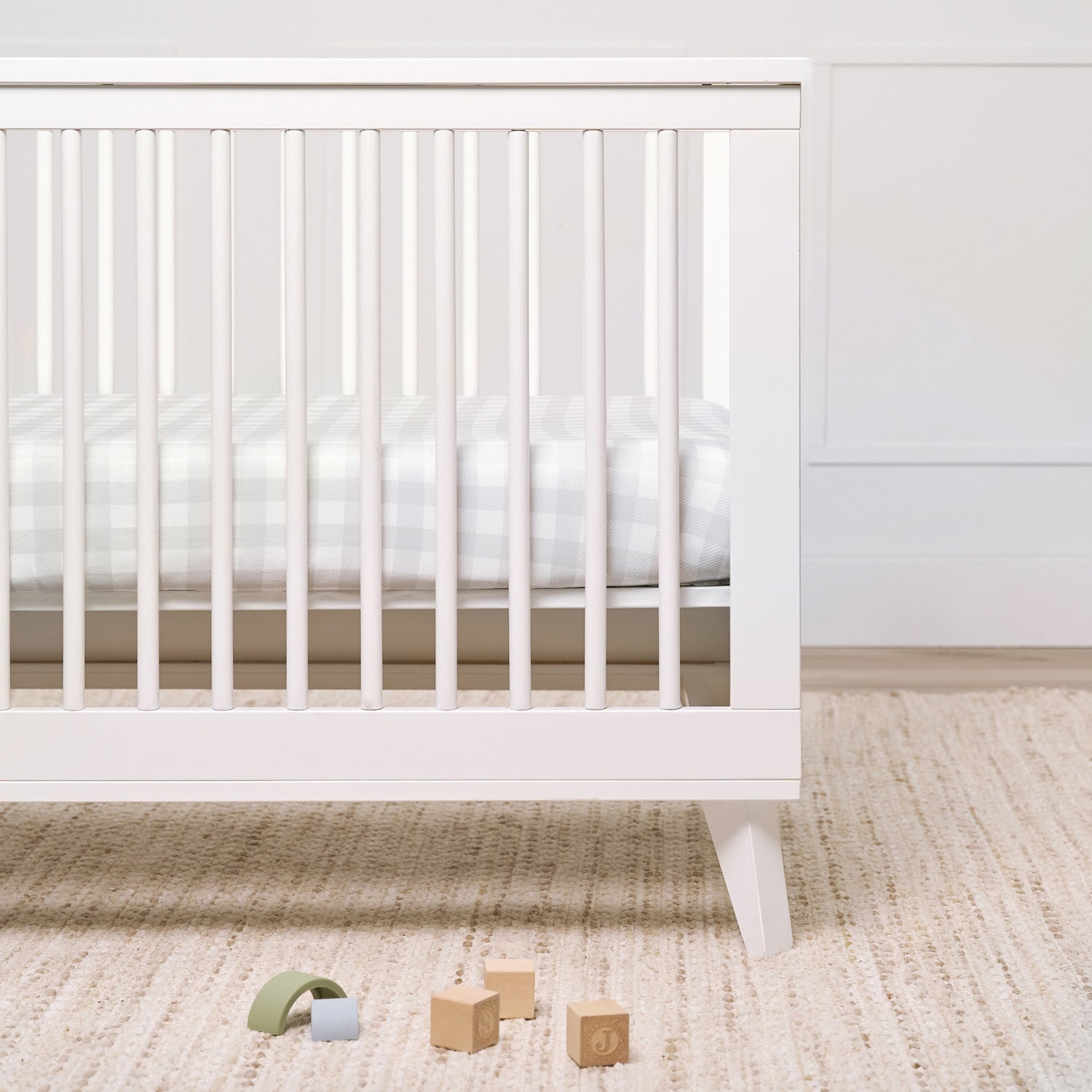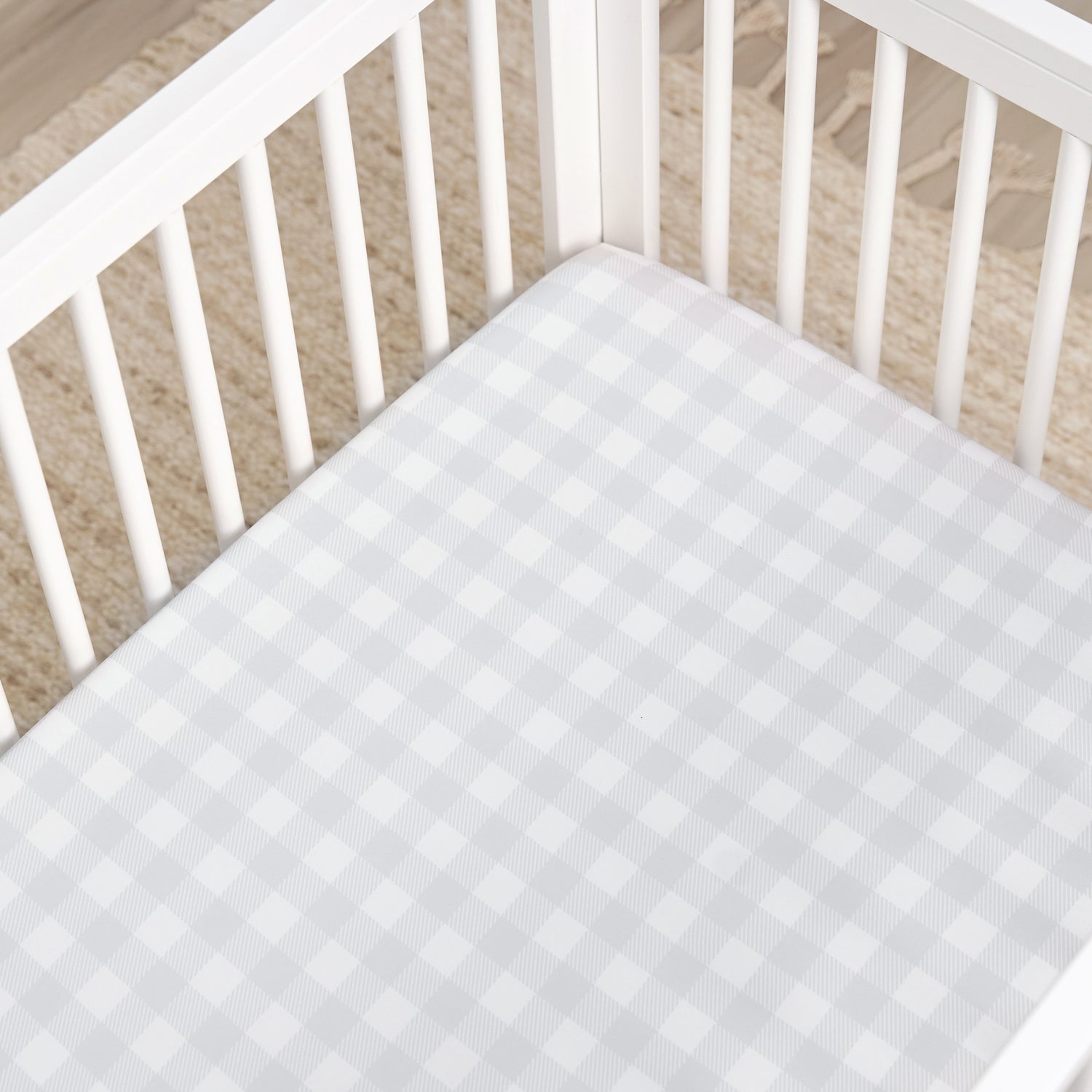Crafted with care for baby girl's or baby boy's nursery, our 2-pack of knit crib sheets is made from durable polyester and stretchy spandex jersey. Sized perfectly at 52" x 28", they easily fit most standard crib mattresses. One sheet features a celestial pattern with stars and moons, while the other offers a versatile gray and white plaid that complements any theme. These crib sheets combine style and comfort, creating a restful sleep space for little one. Our essentials have been independently certified with STANDARD 100 by OEKO-TEX® so that parents don’t have to worry about harmful substances. This pack includes two knit crib sheets.