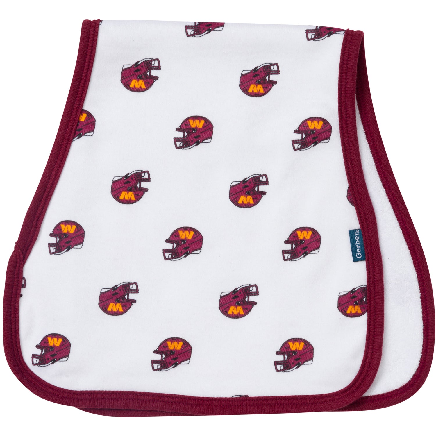 This officially licensed Washington Commanders 3-piece set includes two soft bandana bibs and one oversized burp cloth. Designed with absorbent fabric, the set provides reliable protection against drool and spills. The bibs feature secure snap closures for a comfortable fit, while the burp cloth offers ample coverage to help keep caregivers clean. All items are independently certified with STANDARD 100 by OEKO-TEX, ensuring they are free from harmful substances. Includes two bandana bibs and one burp cloth.
