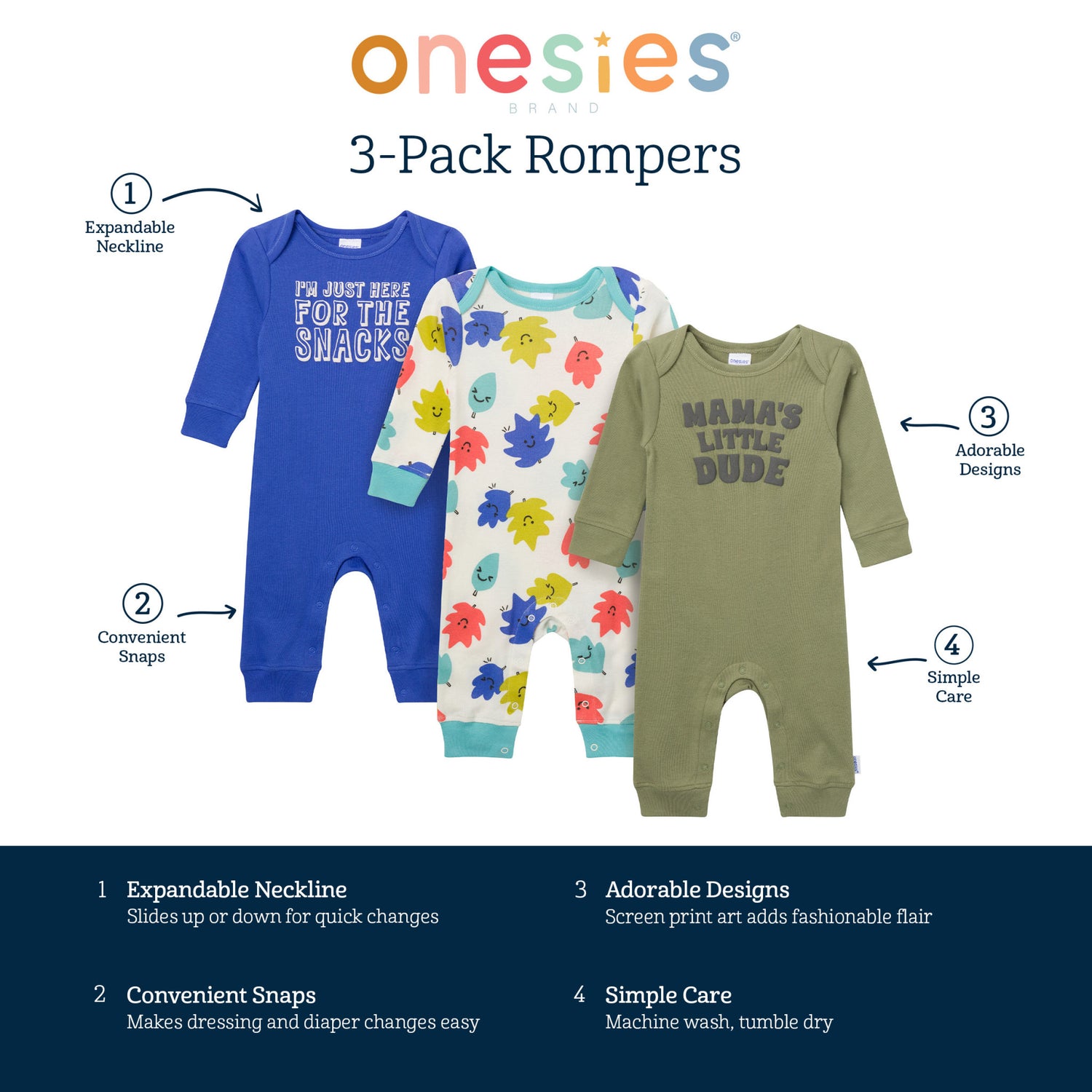 Get little dude ready for cozy adventures in this 3-pack of footless pajamas! With playful prints and fun graphics like “Mama’s Little Dude” and “I’m Just Here for the Snacks,” these PJs are as spirited as the little guy. Made from 100% cotton for softness against sensitive skin, these one-pieces feature lap shoulders and leg snaps for super-easy changes. Cinched wrists and ankles help keep everything in place, whether he’s crawling, wiggling, or napping hard. Our essentials have been independently certified with STANDARD 100 by OEKO-TEX® so that there's no worry about harmful substances in baby’s wardrobe. Includes three footless pajamas.