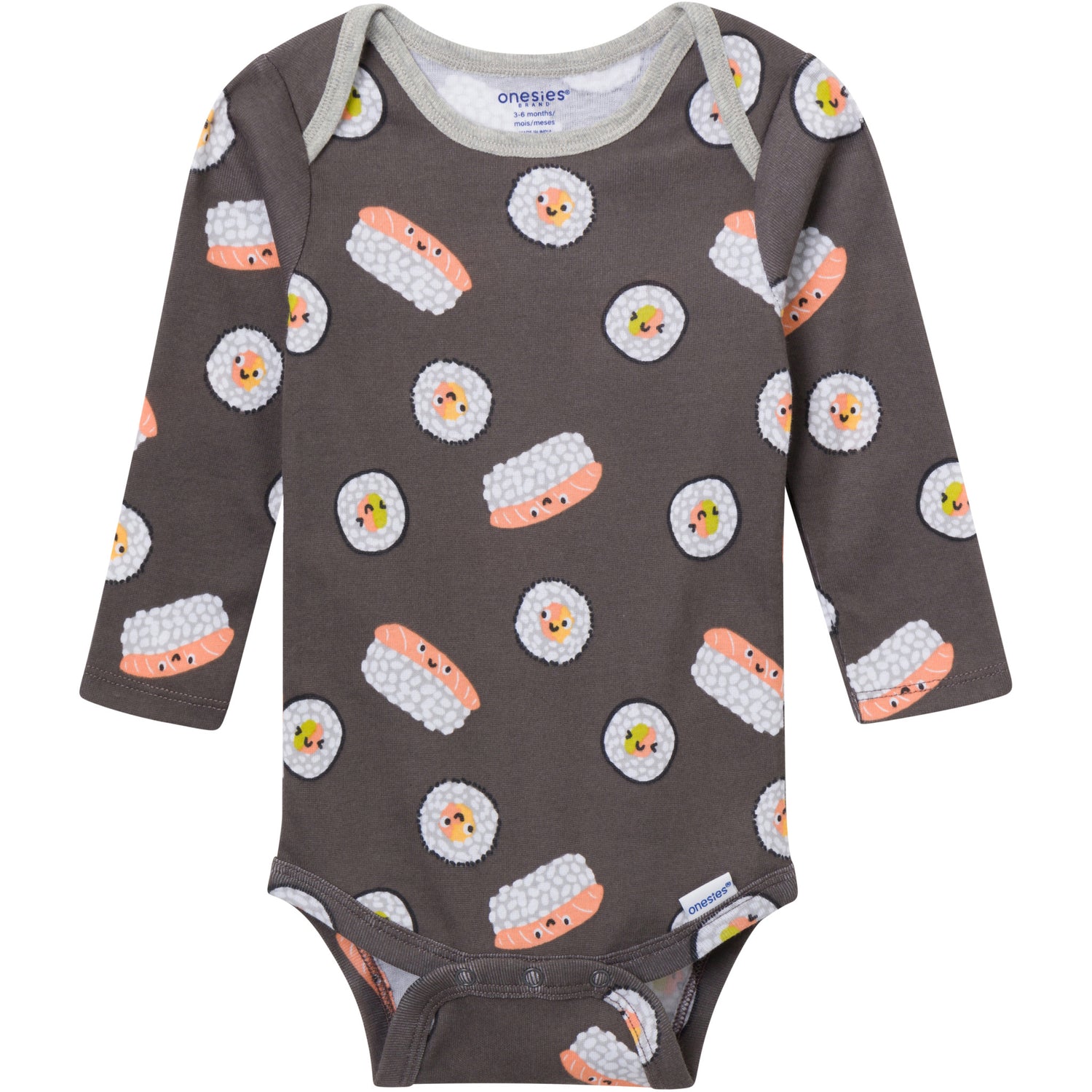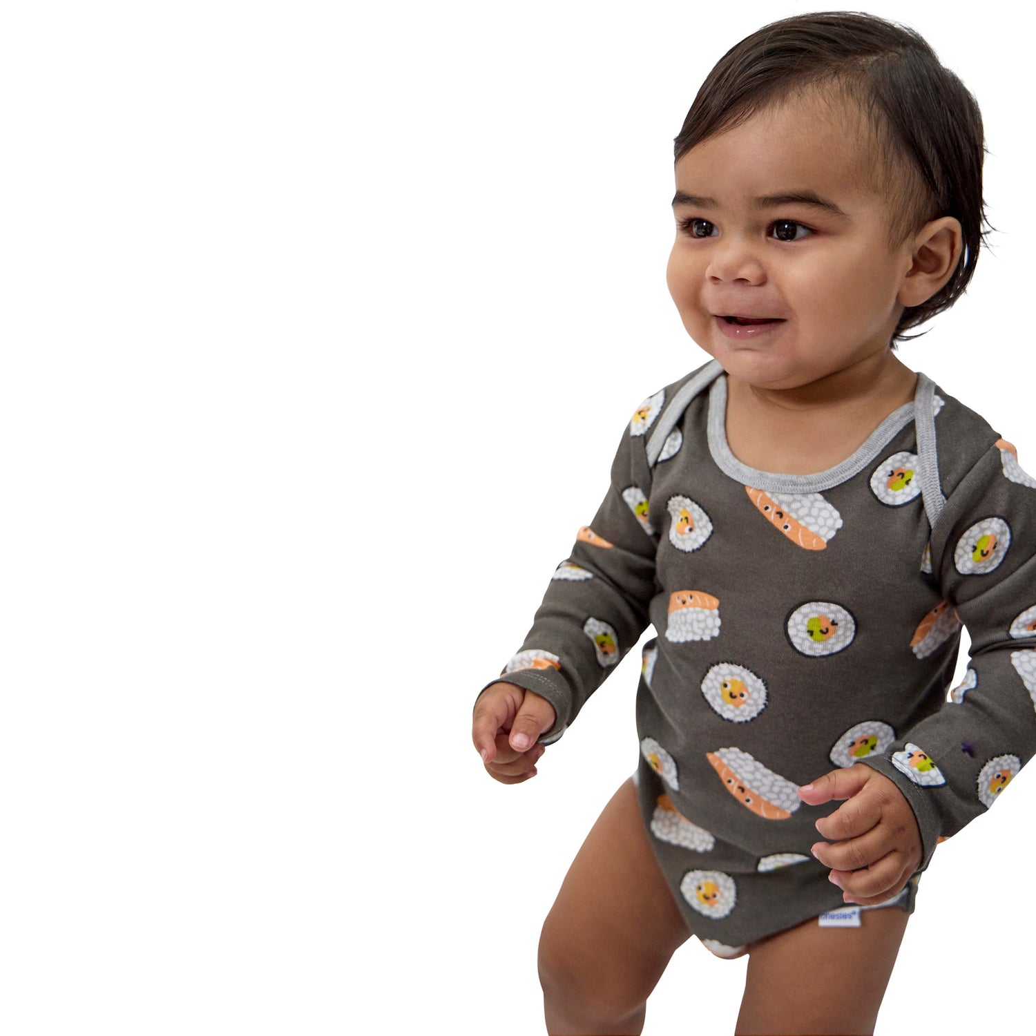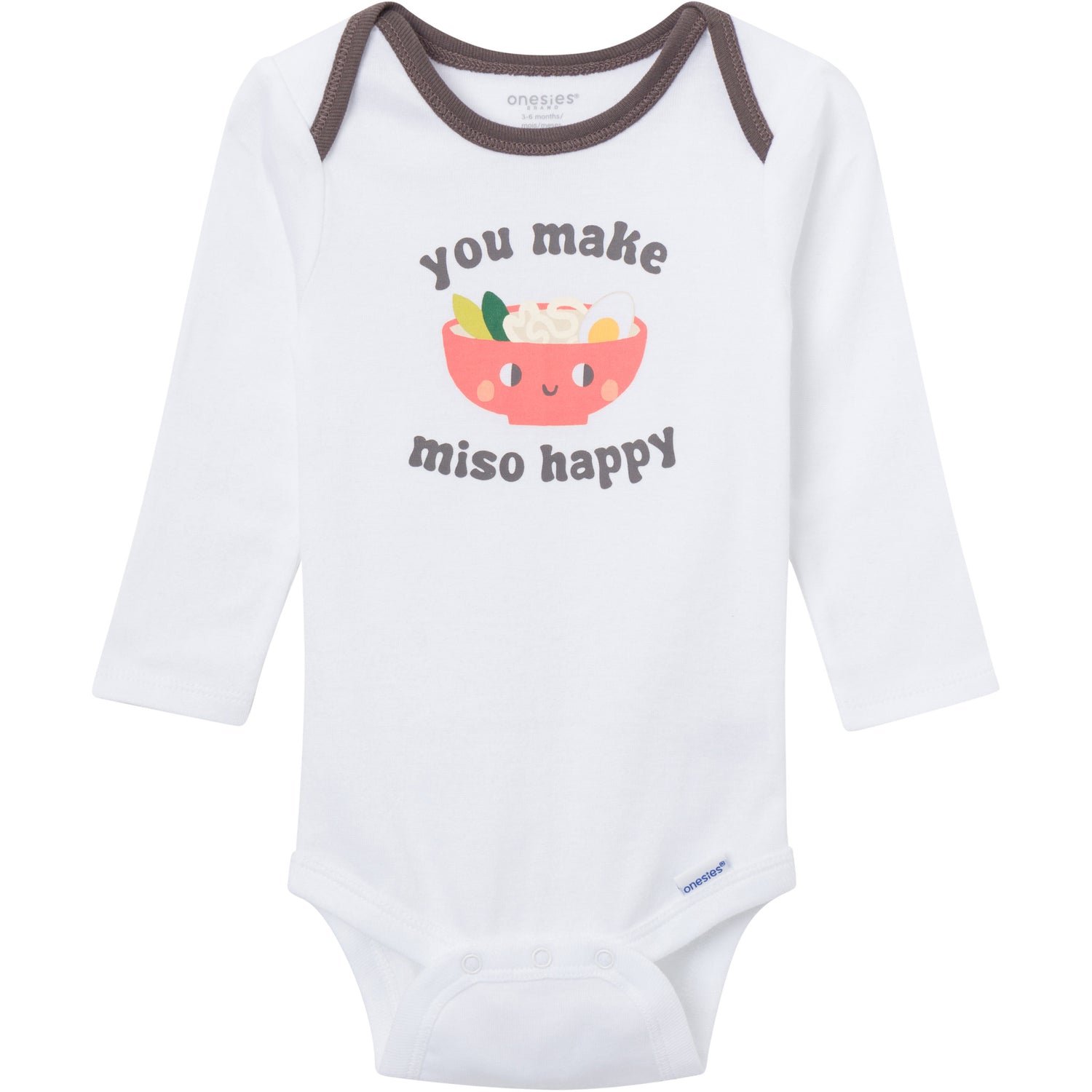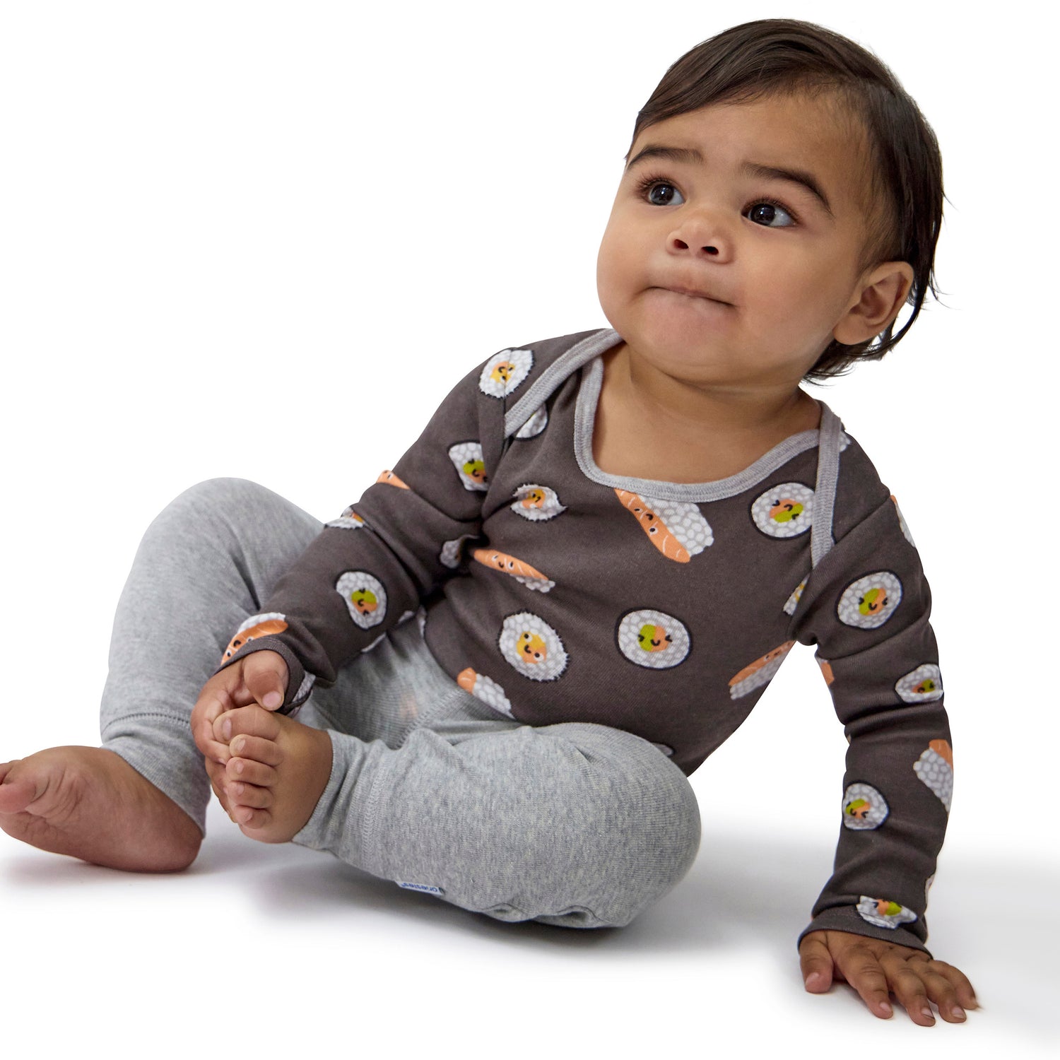 Serve up some smiles with this adorable “Miso” outfit set—perfect for the little foodie! Featuring a playful sushi print and a sweet “You Make Miso Happy” graphic, this 4-piece mix-and-match combo includes two long-sleeve bodysuits and two cozy pants. Made from 100% cotton to keep baby comfy and gentle on sensitive skin, each bodysuit includes lap shoulders and leg snaps for quick changes. The comfort-stretch waistband on the pants makes dressing super easy, whether heading out or staying in for snuggles. Our essentials have been independently certified with STANDARD 100 by OEKO-TEX® so that there's no worry about harmful substances in baby’s wardrobe. Includes two Onesies® bodysuits and two matching pants.