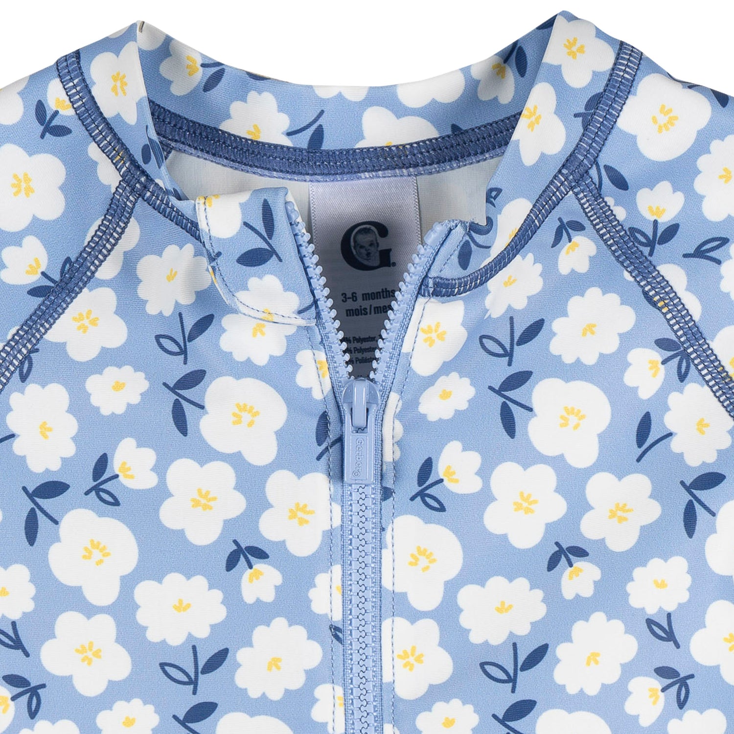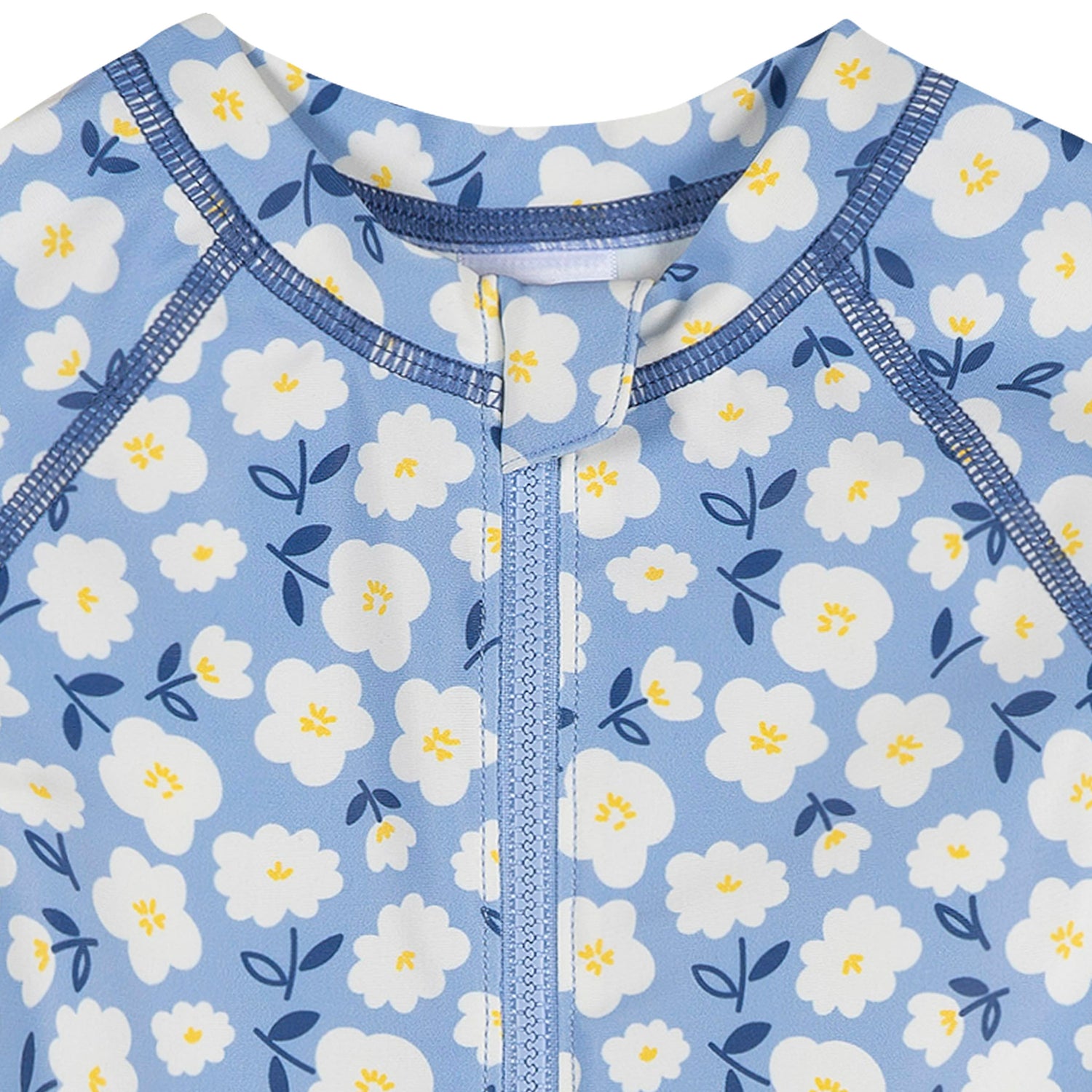 The little one will be ready for all-day water play in this adorable baby girl rashguard swimsuit. Made from soft, quick-dry fabric with UPF 50+ protection, it helps guard her delicate skin from the sun while keeping her comfortable through every splash and giggle. The long sleeve rashguard design offers extra coverage, and the zipper front with a neckline cover makes changes gentle and easy. Bottom snaps make diaper swaps easy, leaving more time for sunny day play. With its cheerful light blue color and sweet white daisy print, this baby girl swimsuit is made for fun under the sun. Our essentials have been independently certified with STANDARD 100 by OEKO-TEX® so that there's no worry about harmful substances in little one’s wardrobe.