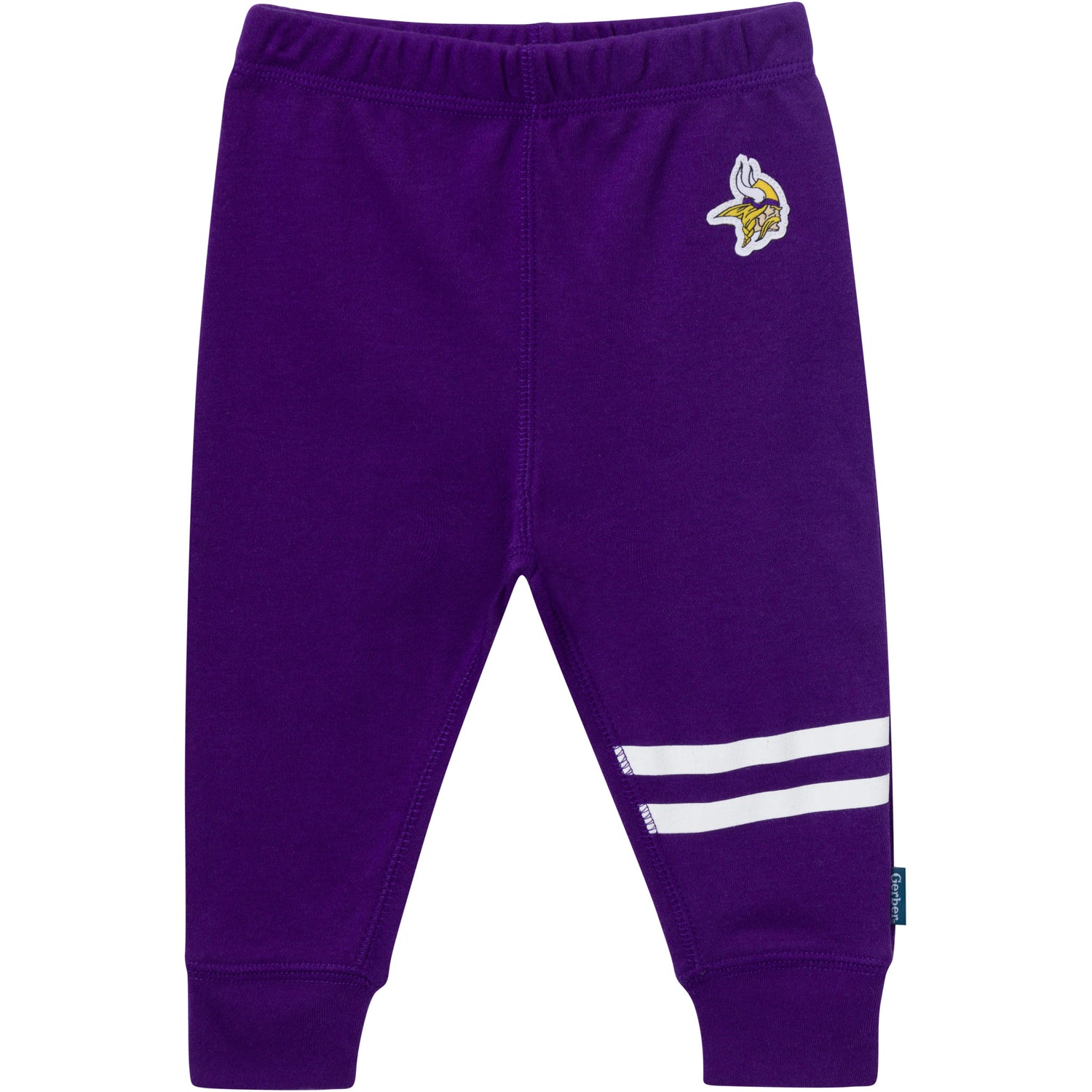 This Minnesota Vikings 3-piece set includes a soft bodysuit, coordinating pull-on pants, and a matching bow headband. The bodysuit is designed with lap shoulders and bottom snaps for easy dressing and quick changes, while ribbed trim provides a comfortable fit. The pants and headband are styled in bold team colors for a complete, coordinated look. All pieces are independently certified with STANDARD 100 by OEKO-TEX®, ensuring they are free from harmful substances. Set includes bodysuit, pants, and headband.
