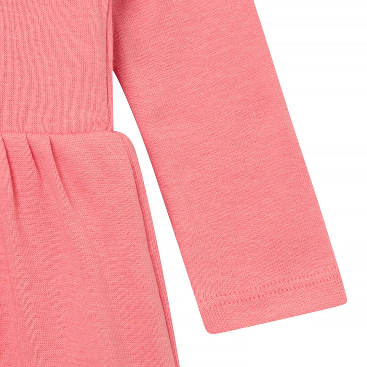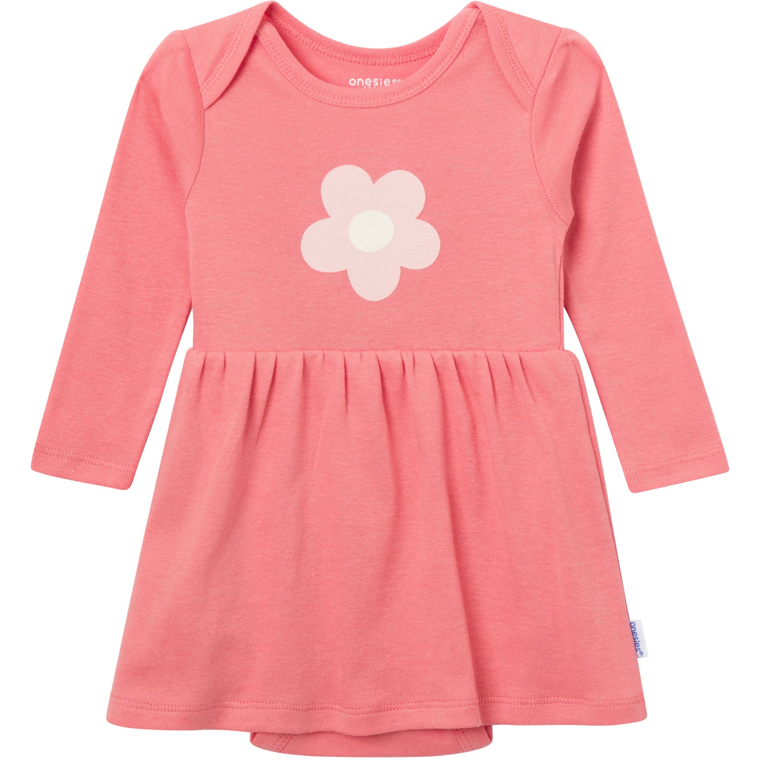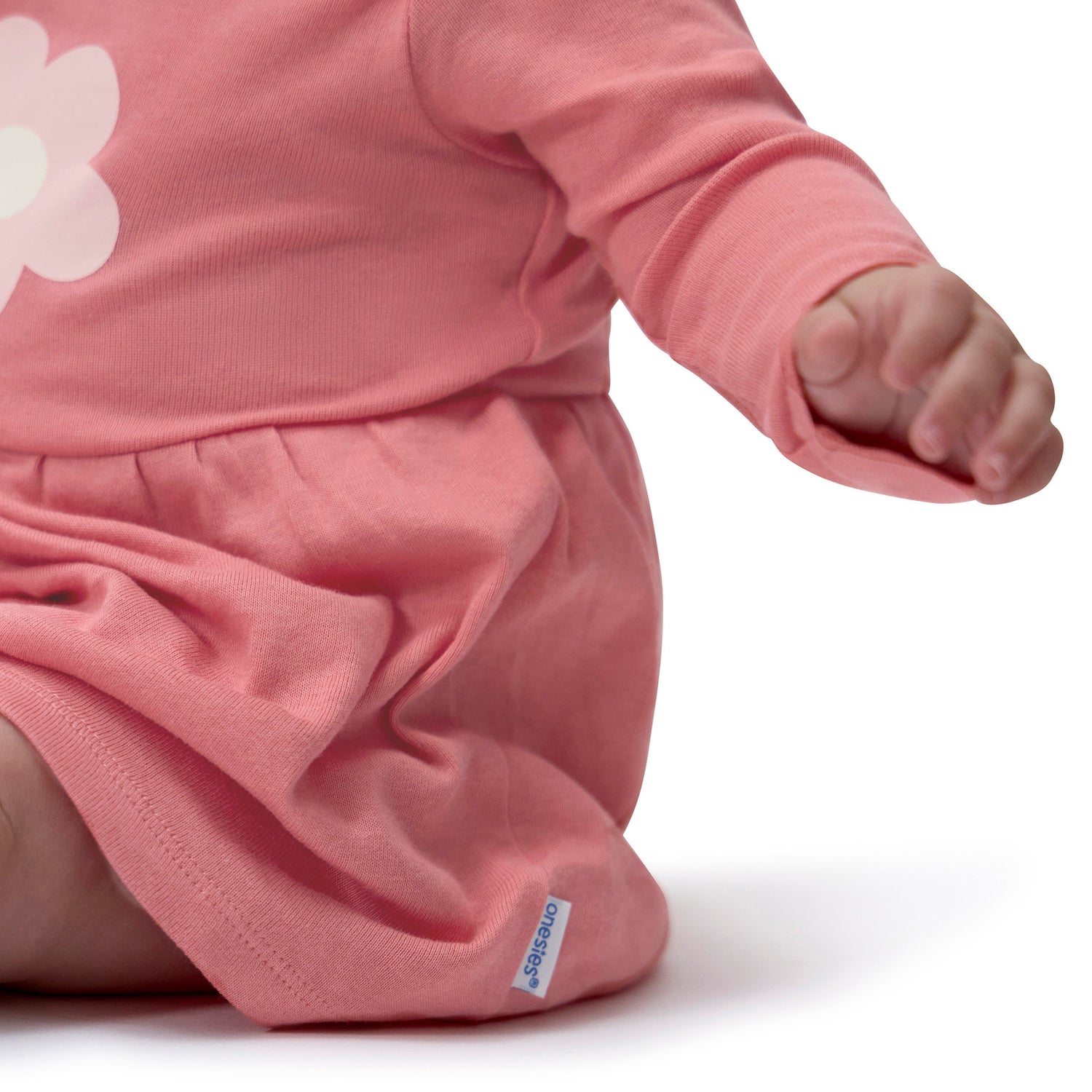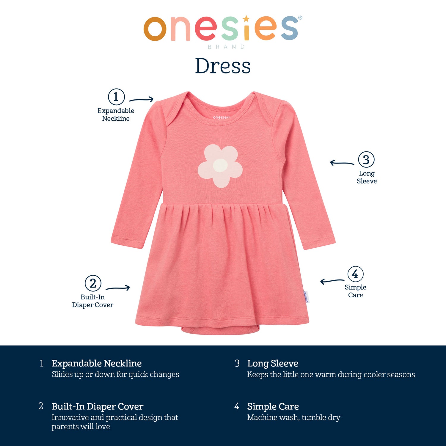 Say hello to cozy cuteness! This long sleeve baby girl dress is made from 100% cotton to keep her comfy and happy all day long. The lap shoulder neckline makes messy diaper changes easy with simple removal down over legs. A built-in diaper cover completes the look with a sweet, ruffled hem that twirls with every wiggle. Soft, simple, and oh-so-sweet! Our essentials have been independently certified with STANDARD 100 by OEKO-TEX® so that there's no worry about harmful substances in baby’s wardrobe. Includes one dress.
