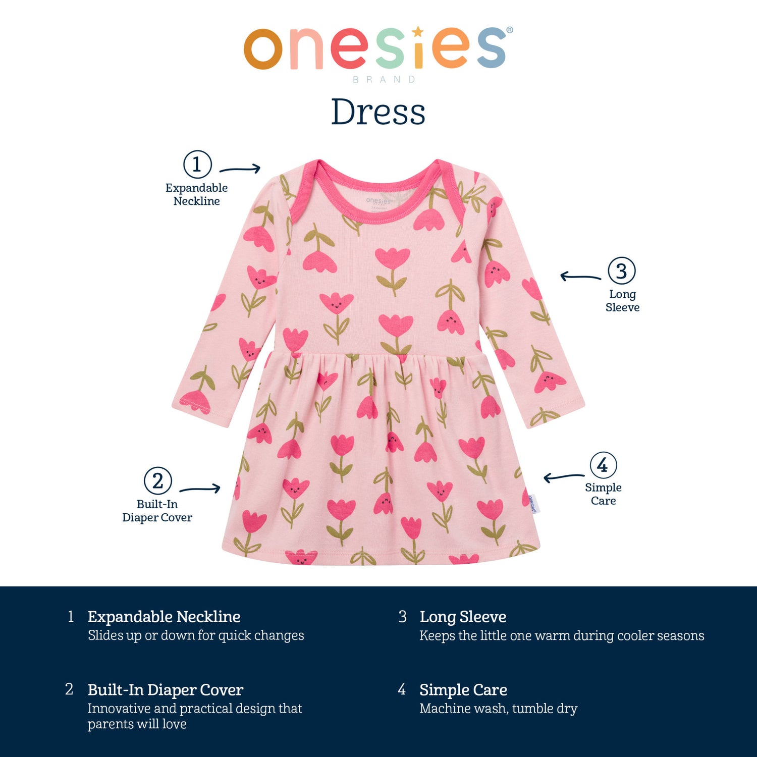 We took everything parents love—comfort, convenience, and cuteness—and stitched it into one perfect dress! Made from 100% cotton, this long sleeve piece is soft on baby’s skin and perfect for cooler days. The lap shoulder neckline allows for parents to pull it down over the legs, and the integrated diaper cover keeps her covered no matter how much she wiggles. Our essentials have been independently certified with STANDARD 100 by OEKO-TEX® so that there's no worry about harmful substances in baby’s wardrobe. Includes one dress.