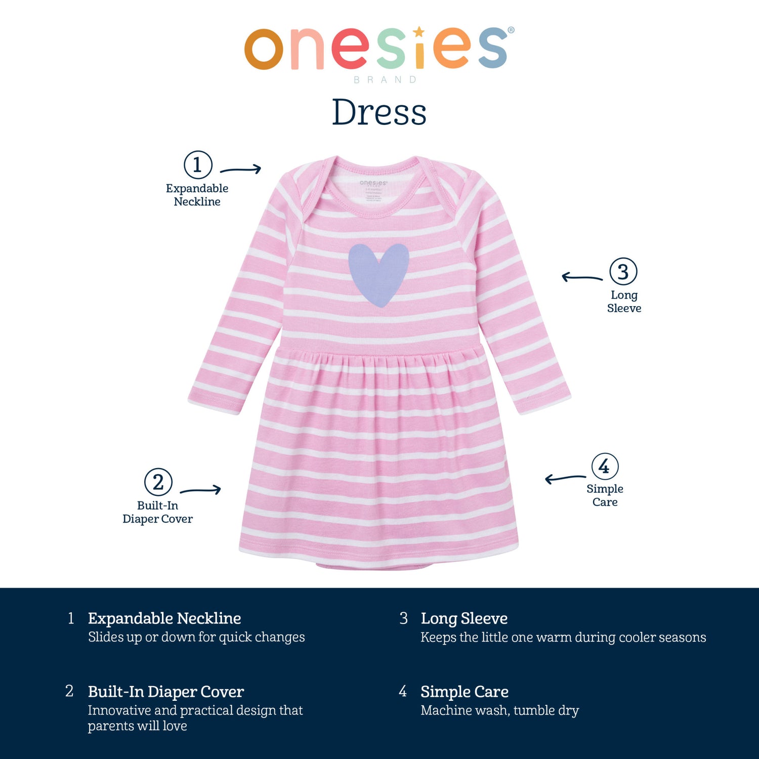 - Lap shoulder neckline makes dress easy to remove down over legs for diaper changes