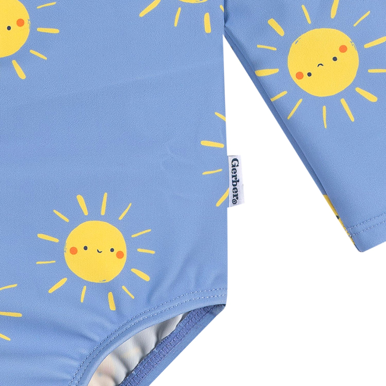 Brighten up any water day with this baby girl rashguard-style swimsuit is made from UPF 50+ fabric to help protect her from the sun during water play. The quick-dry, water-wicking material keeps her comfortable through every splash, while the zip-up front with a neckline cover offers gentle, fuss-free dressing. Bottom snaps make changes easier on the go, and the long sleeves provide added coverage. Finished in light blue with a joyful smiley sunshine print, this baby girl rashguard swimsuit is made for easy, breezy days by the water. Our essentials have been independently certified with STANDARD 100 by OEKO-TEX® so that there's no worry about harmful substances in little one’s wardrobe.