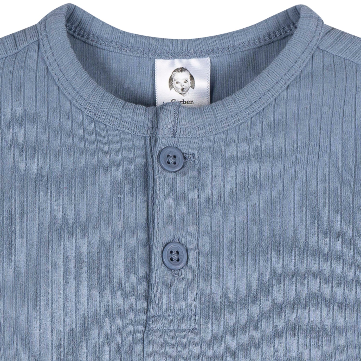 Bring on the cuddles with this charming soft blue 2-piece set. Made from a cozy cotton-spandex blend with a fine ribbed texture, this outfit is designed to move with baby while keeping them comfortable from morning to night. The button placket detail adds a sweet touch to the top, while the pull-on pants feature a stretchy waistband that makes changes quick and easy. Our essentials have been independently certified with STANDARD 100 by OEKO-TEX® so that there's no worry about harmful substances in little one’s wardrobe. Includes matching top and bottom.