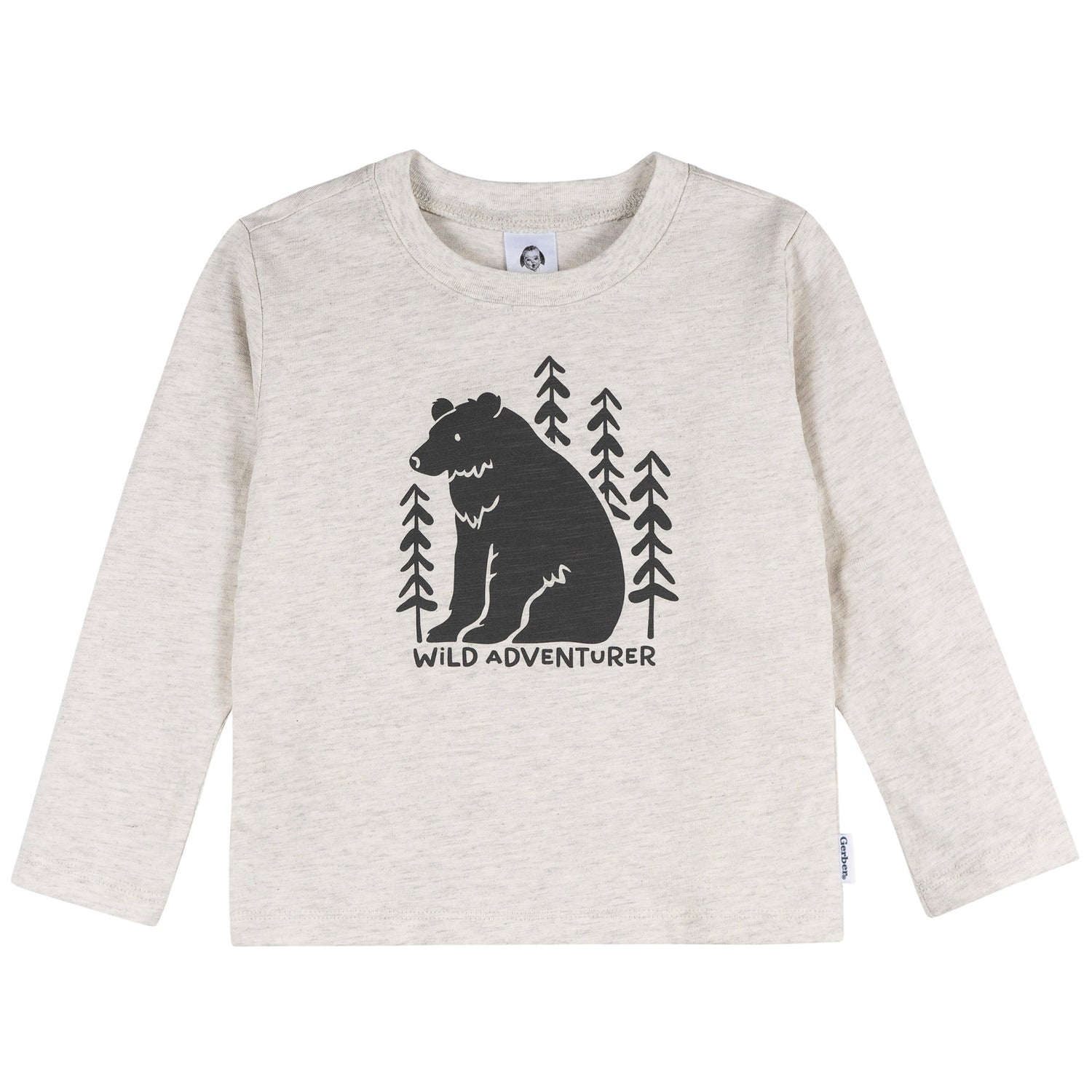 Adventure-ready and made for little explorers, this toddler boy's fall outfit is a must-have for cool-weather play. Crafted with soft, stretchy fabric, it's designed to keep up with every jump, climb, and tumble. The long-sleeved top and matching pants are perfect for outdoor fun, with a cozy comfort-stretch waistband and cinched ankles that stay put during all-day play. Featuring forest-inspired screenprint art with a friendly bear and the words “Wild Adventurer,” the little guy will be all set for the season in shades of green and gray. Our essentials have been independently certified with STANDARD 100 by OEKO-TEX® so that there's no worry about harmful substances in little one’s wardrobe. Includes matching top and bottom.