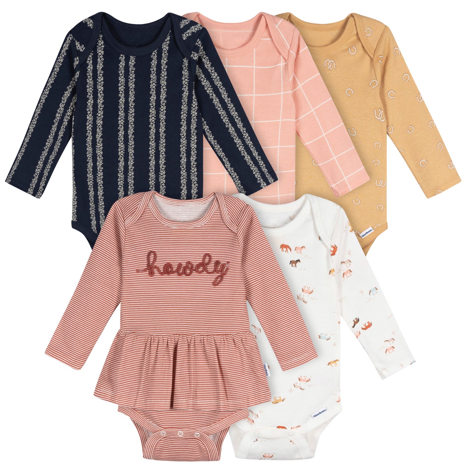 Giddy up, little one! This 5-pack of long-sleeve bodysuits is bringing all the wild-west charm with adorable horse-themed prints—think galloping ponies, horseshoes, and a dash of western paisley. Made from 100% cotton, these bodysuits are soft, breathable, and gentle on sensitive skin. The lap shoulder neckline makes messy changes no big deal (just slide it down over the legs!), and leg snaps help get diaper duty done in a flash. With long sleeves for cozy comfort, this set is perfect for little cowpokes who are always on the move! Our essentials have been independently certified with STANDARD 100 by OEKO-TEX® so that there's no worry about harmful substances in baby’s wardrobe. Pack includes five bodysuits.