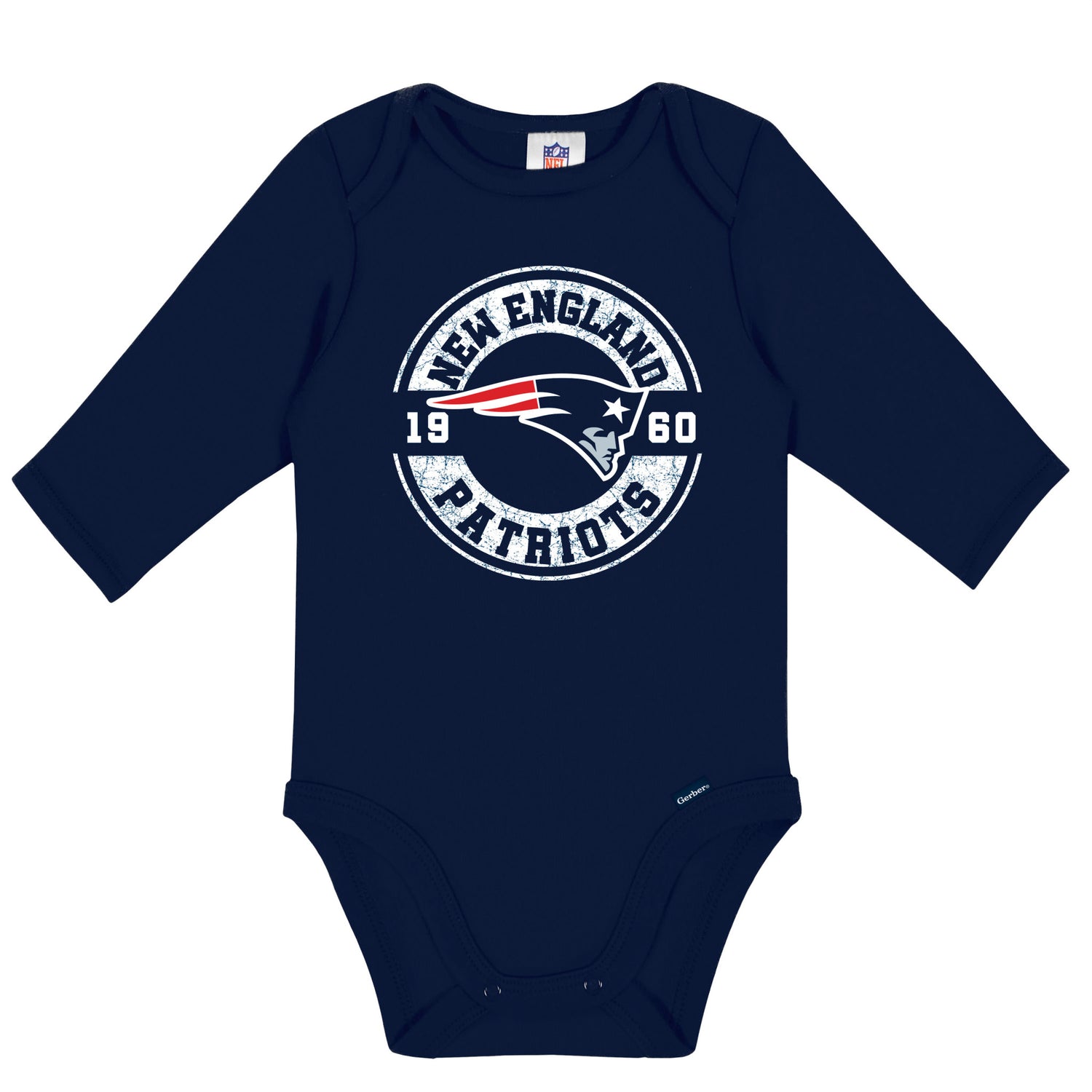 2-pack long sleeve Patriots baby bodysuits built for comfort and easy changes. Crafted from soft, sturdy fabric that’s cozy for naps and durable for play. Lap shoulders and bottom snaps simplify dressing, while ribbed trim provides a flexible fit. STANDARD 100 by OEKO-TEX® certified. Includes two baby bodysuits.