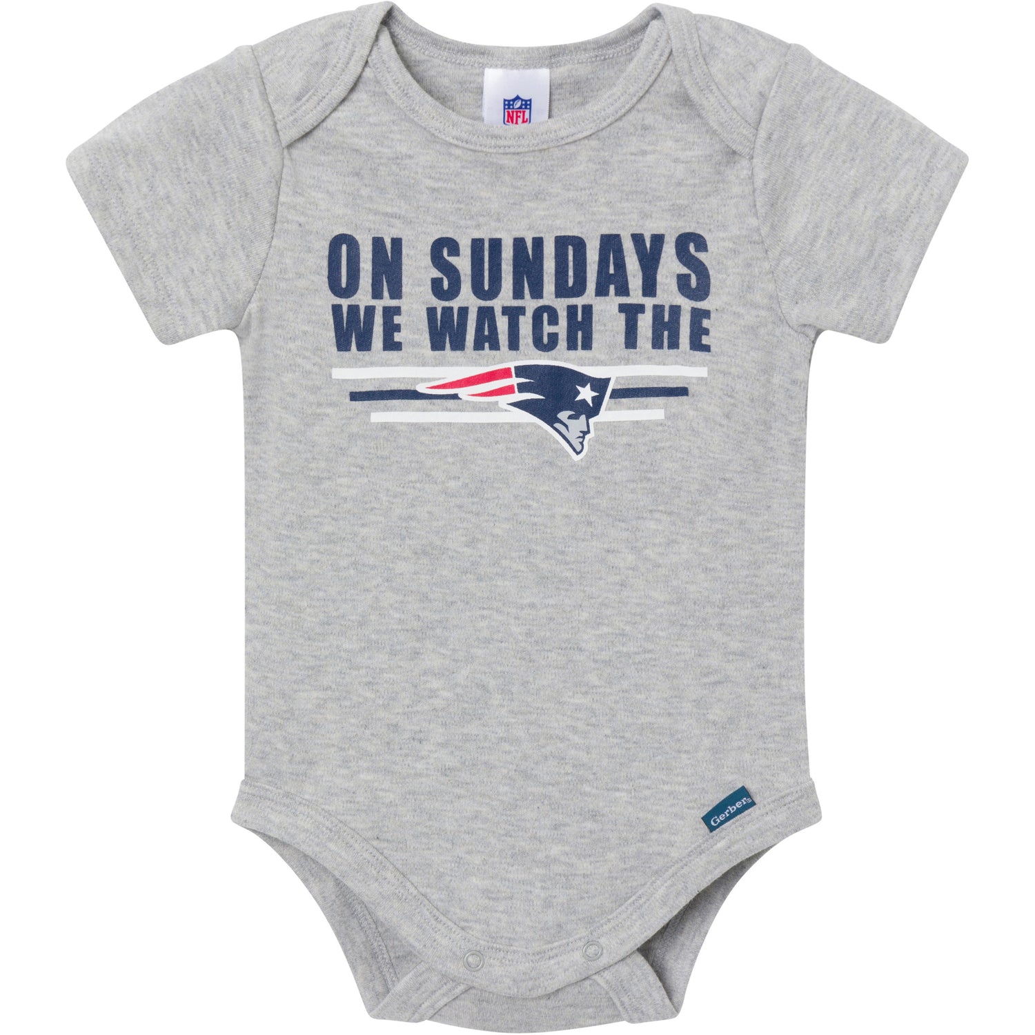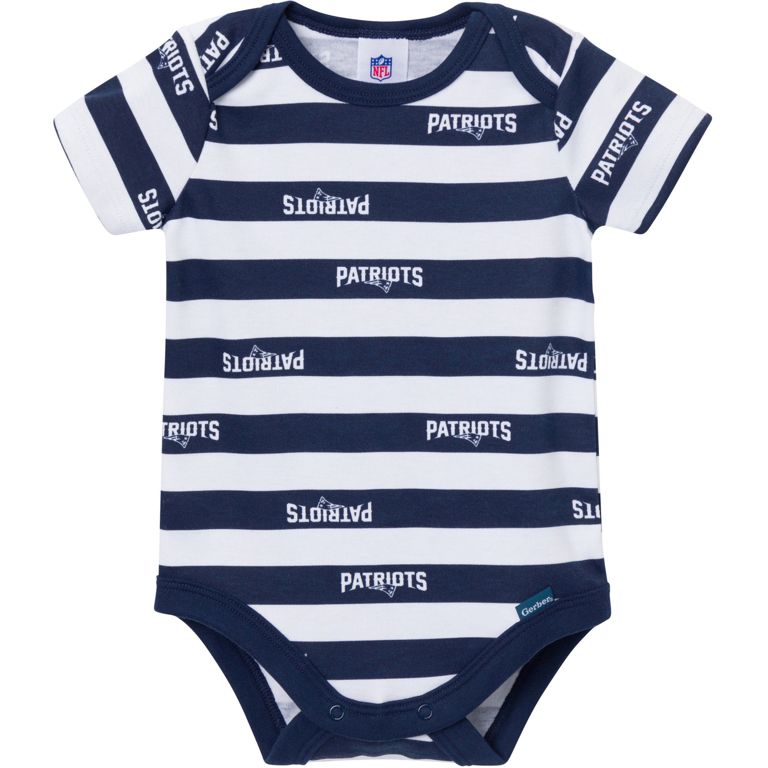 3-pack Patriots baby bodysuits designed for everyday comfort and quick changes. Soft fabric with stretch, lap-shoulder neckline, and bottom snaps for easy dressing; rib trim helps the fit move with baby. STANDARD 100 by OEKO-TEX® certified. Includes three baby bodysuits.