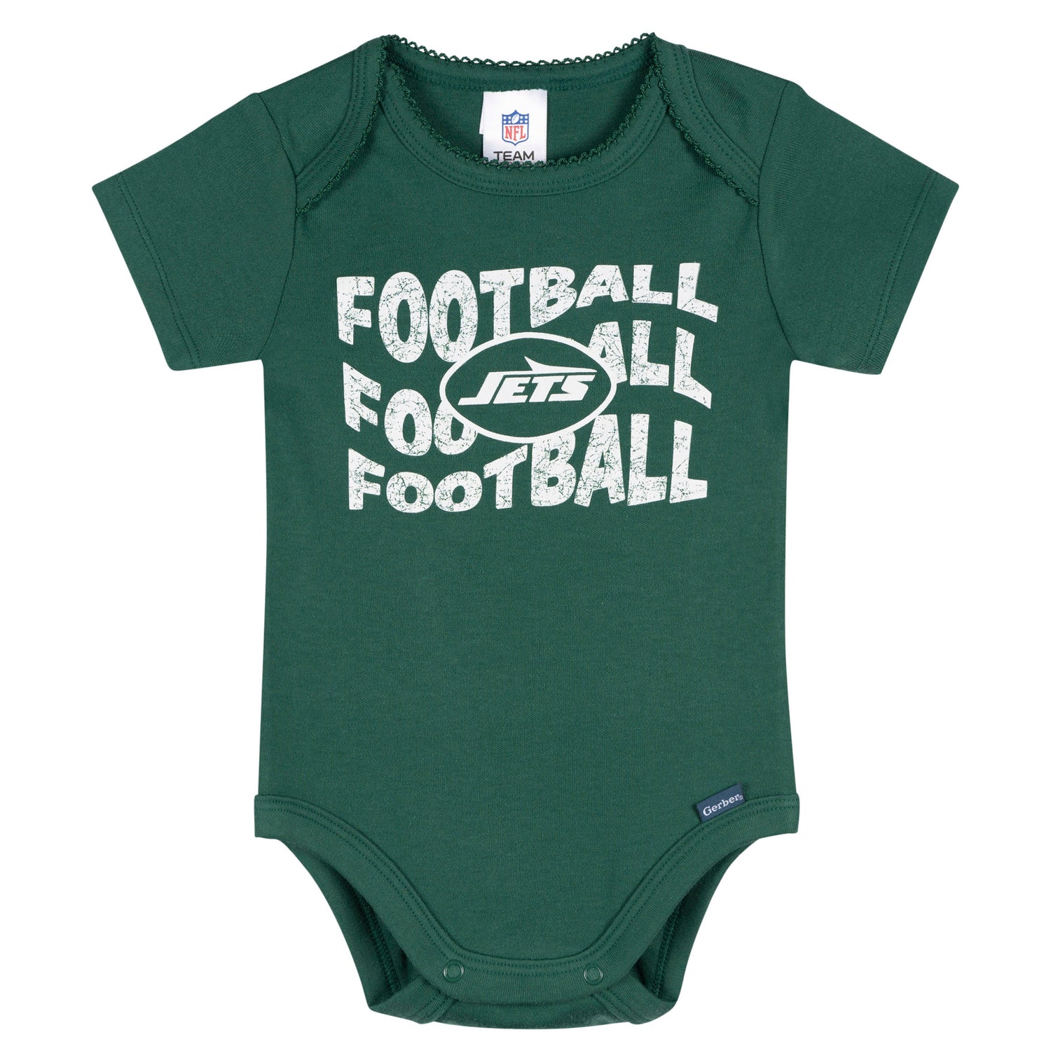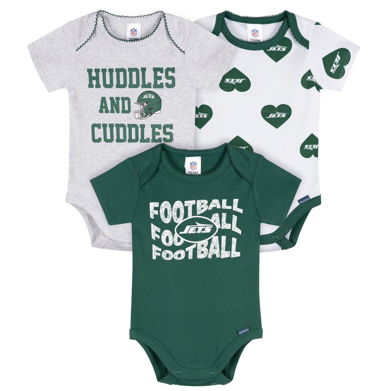 This New York Jets 3-pack of baby girl bodysuits is made from soft, slightly stretchy fabric with a durable, cozy feel for everyday wear. Each piece includes a lap shoulder neckline for easy dressing, leg snaps for quick changes, and ribbed trim at the neckline and leg openings for a flexible fit. Heart-themed Jets graphics add a playful design element with authentic team spirit. All items are independently certified with STANDARD 100 by OEKO-TEX, ensuring they are free from harmful substances. Set includes three bodysuits.
