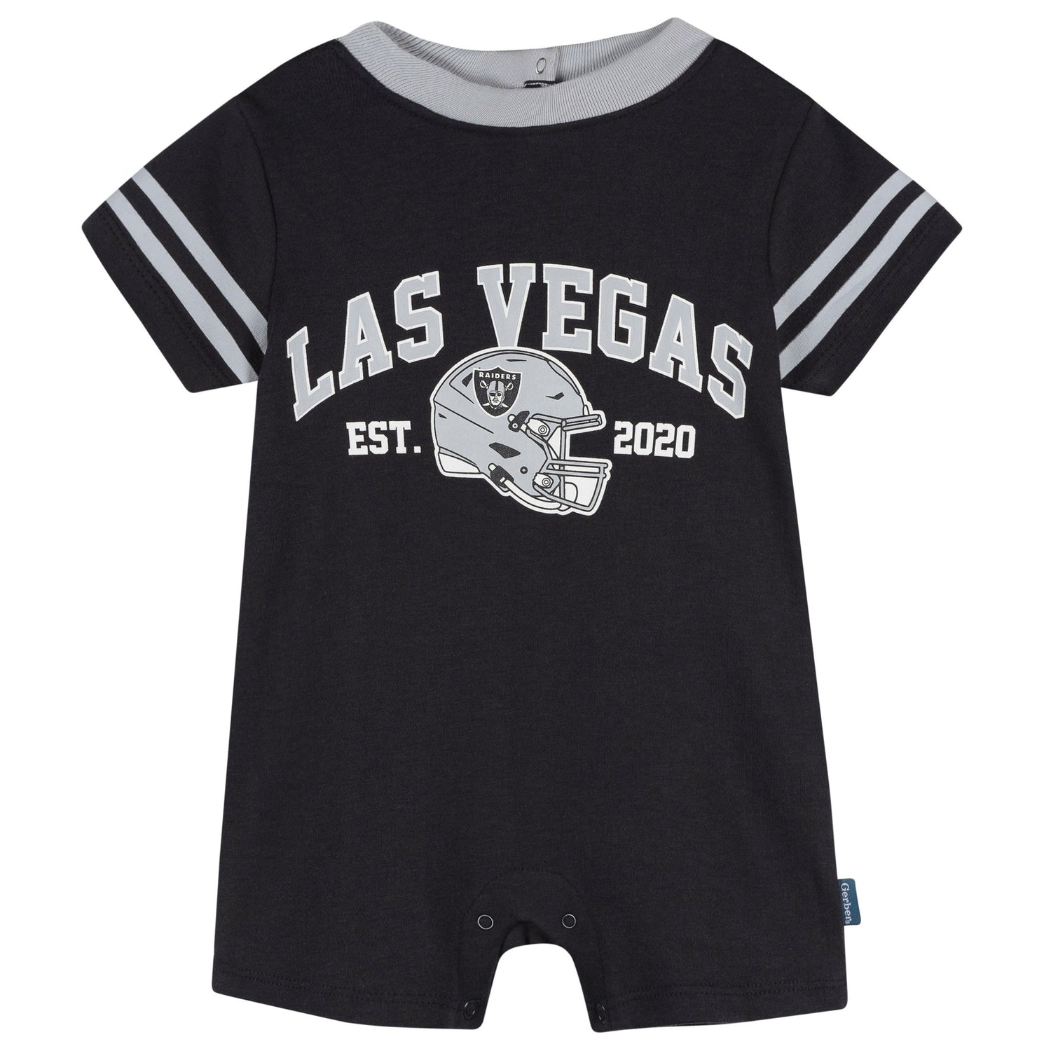 Las Vegas Raiders baby romper made from soft, stretch fabric for comfort and flexibility. Designed with short sleeves and legs, this one-piece is ideal for warm weather wear. The fabric moves easily with infants, making it suitable for play or game-day wear. Certified STANDARD 100 by OEKO-TEX®, tested for harmful substances. One piece per pack.
