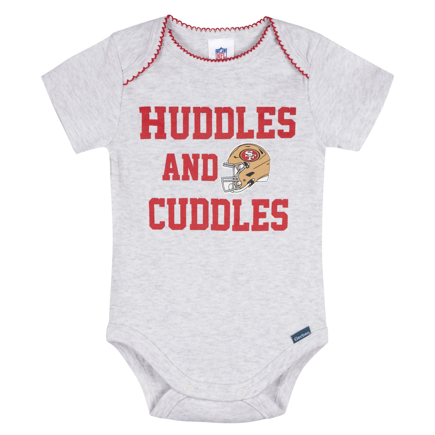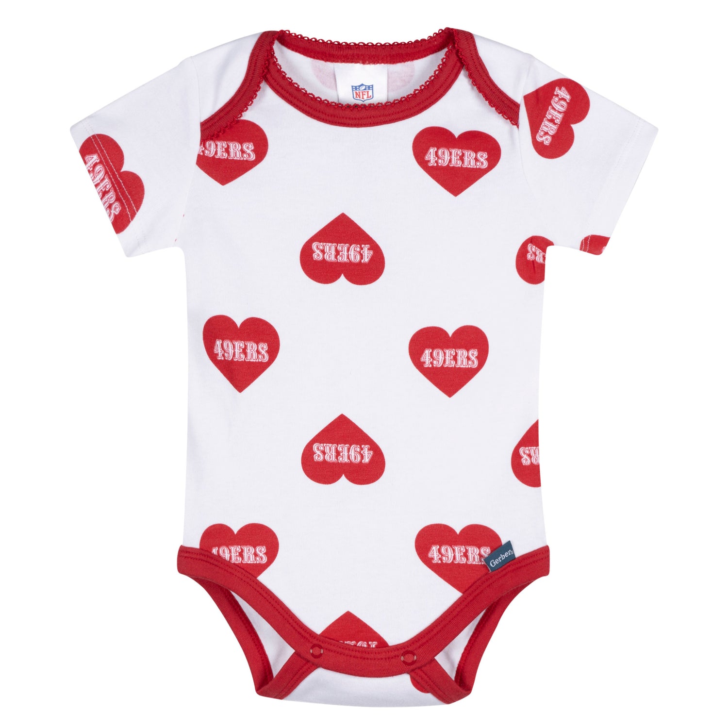 This officially licensed San Francisco 49ers 3-pack of bodysuits is designed in soft, slightly stretchy fabric with a durable hand feel, ideal for everyday wear. Each style features a lap shoulder neckline for easy dressing and leg snaps for quick changes. Ribbed trim at the neckline and leg openings ensures a comfortable fit that moves with active infants. The set includes 49ers-themed artwork with heart details, offering a playful look for team apparel assortments.