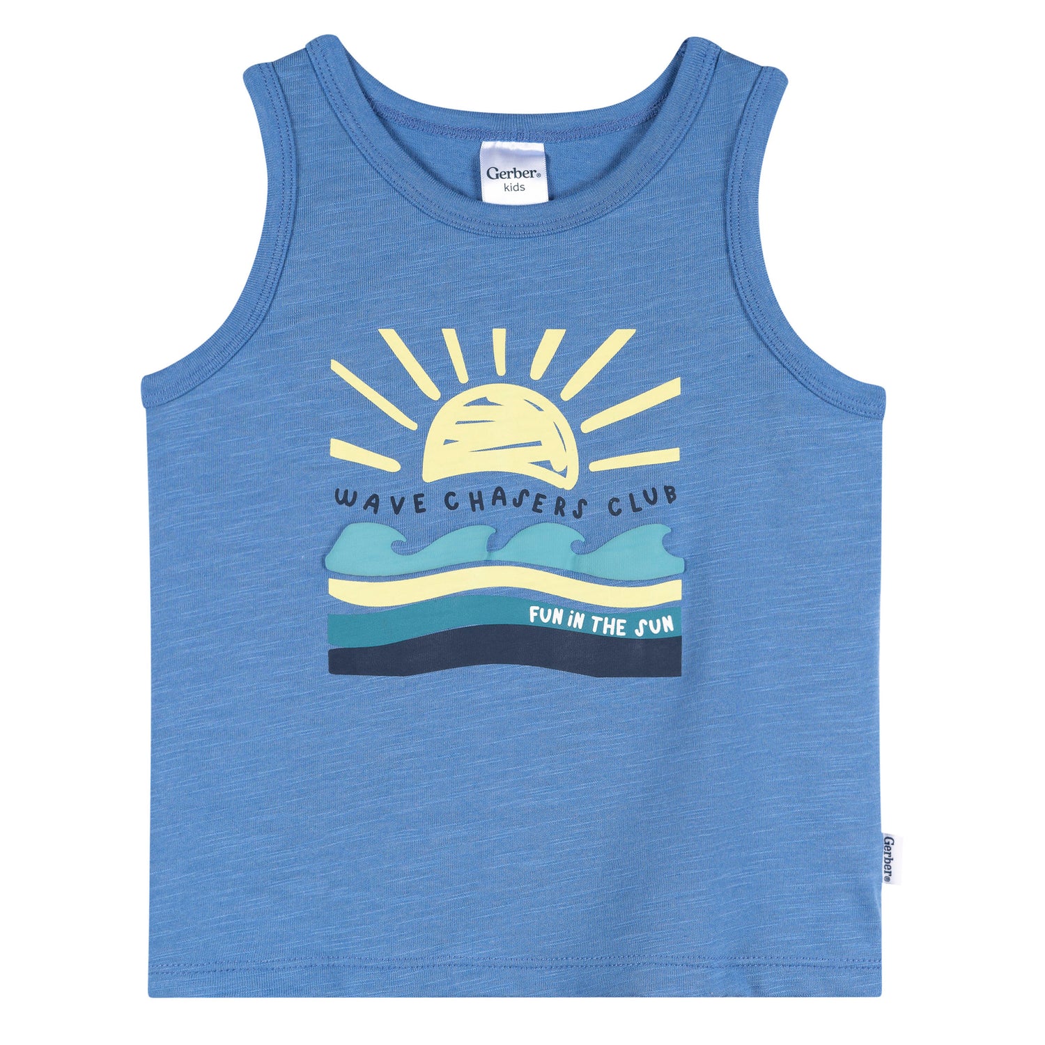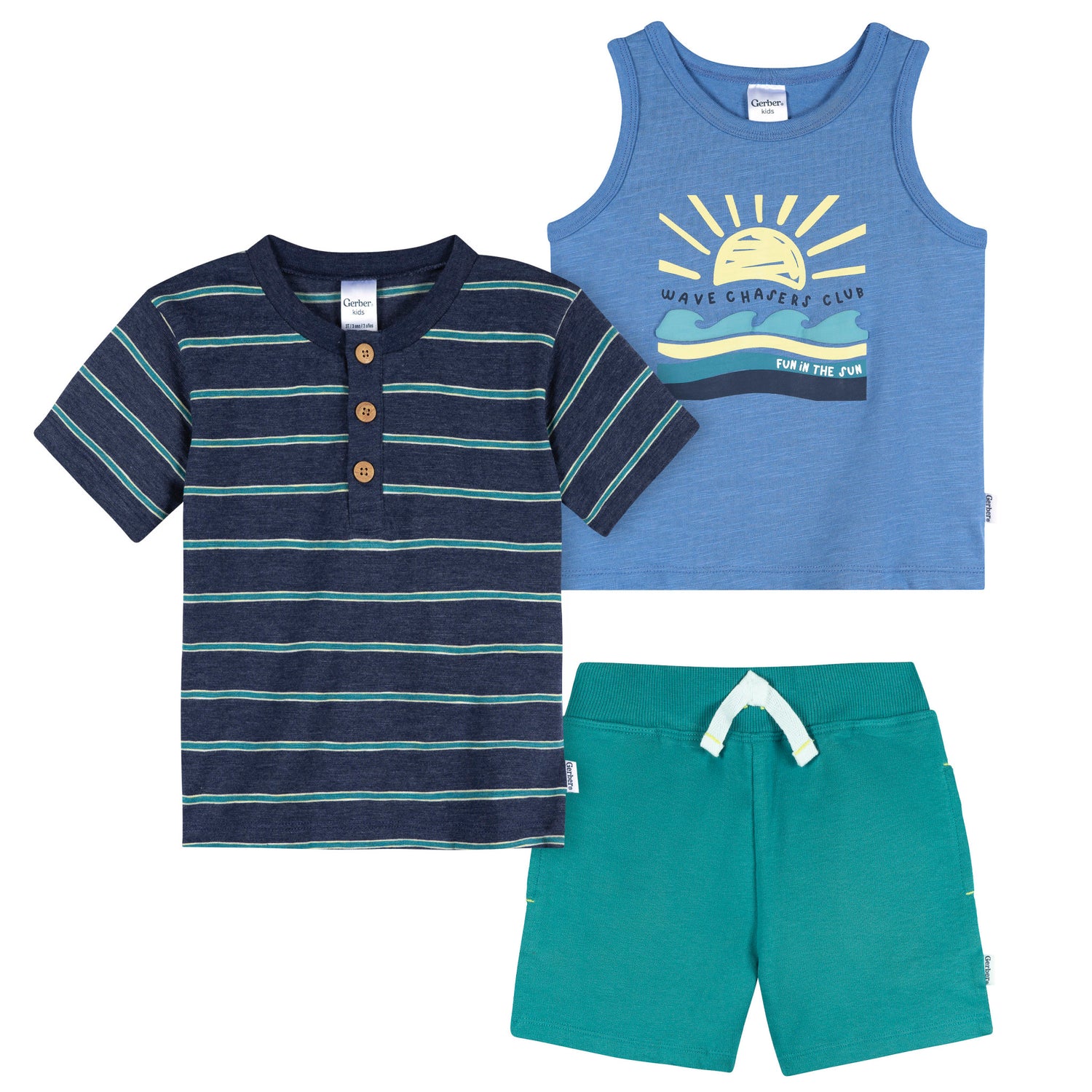 Let him soak up every sunny moment in this playful baby boy outfit set built for all-day adventure. With a soft, stretchy feel and relaxed fit, each piece is made to move with your little one—whether he's chasing bubbles or collecting beachside treasures. The set includes a tank top with a bright sun print and “Wave Chasers Club” text, a striped blue T-shirt with faux wood buttons, and a pair of easy-on shorts designed with a comfort-stretch waistband and functional pockets. From backyard play to vacation days, this toddler boy summer clothes set makes dressing simple and full of fun. Our essentials have been independently certified with STANDARD 100 by OEKO-TEX® so there's no worry about harmful substances in little one’s wardrobe.