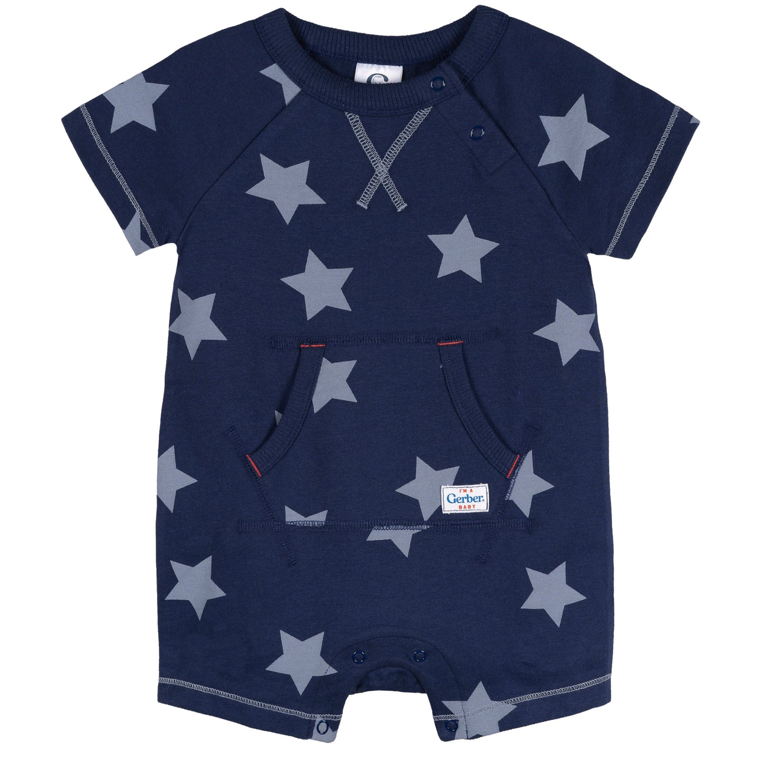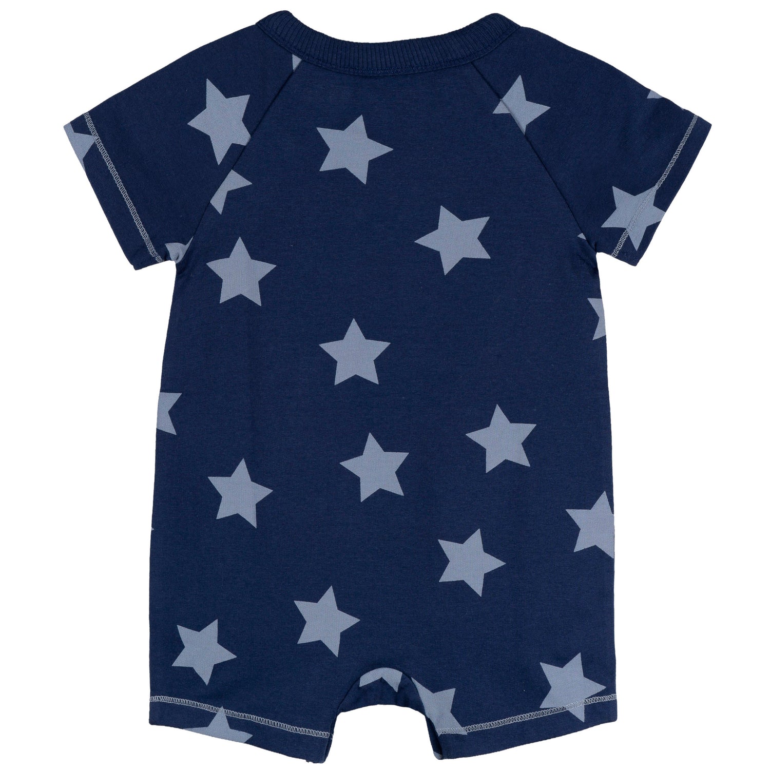 This baby boy romper combines playful design with practical comfort for warm-weather days. Made from a soft cotton-spandex blend, it offers a breathable fit with just the right amount of stretch for crawling, rolling, and exploring. The large light blue star print pops against the navy background, while a front kangaroo pocket adds a fun, functional twist. Snap closures at the bottom make diaper changes quick and easy. Our essentials have been independently certified with STANDARD 100 by OEKO-TEX® so that there's no worry about harmful substances in little one’s wardrobe.