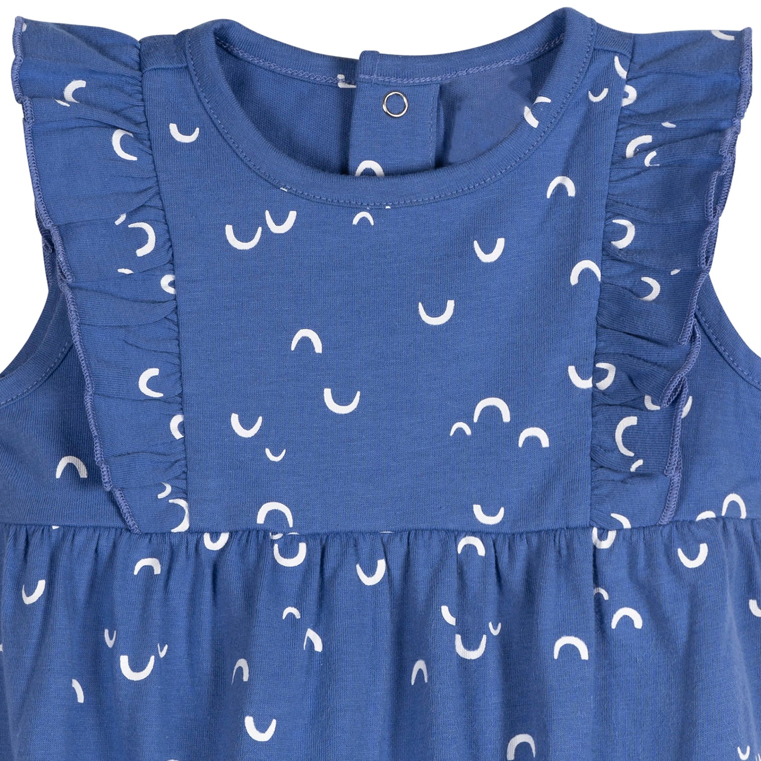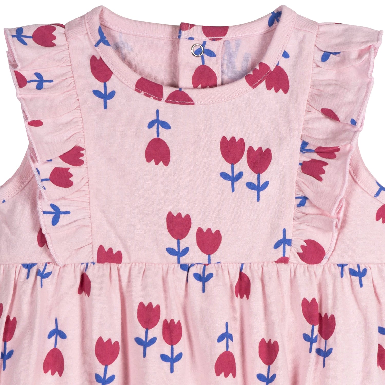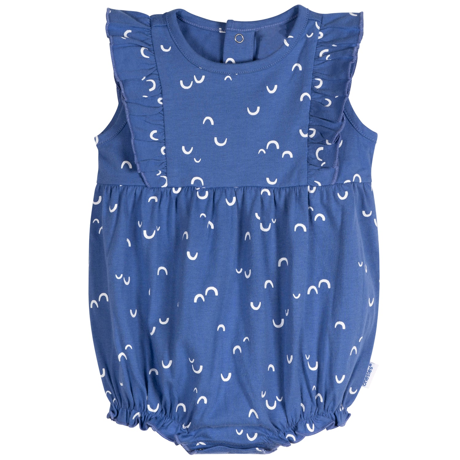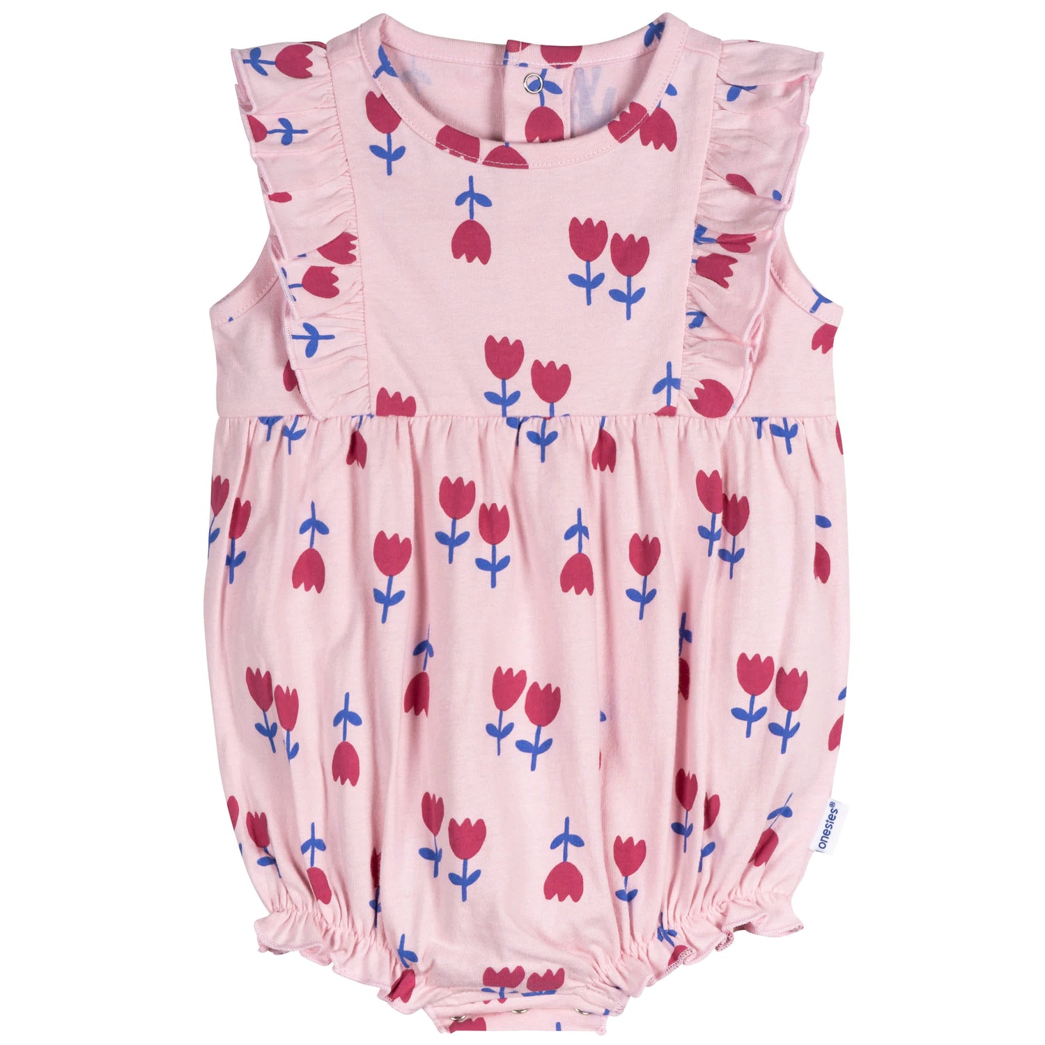 Get ready for playtime with this pack of three delightful baby girl rompers! Crafted from 100% cotton, these rompers are soft and gentle on sensitive skin, ensuring all-day comfort for any active little one. With convenient leg snaps for easy dressing and diaper changes, plus stretchy leg holes for a flexible fit, these rompers are designed for carefree fun. Featuring a charming color scheme of pink, blue, and white, each romper is adorned with adorable strawberry and flower patterns. The playful shoulder ruffles add a whimsical touch, making these rompers an irresistibly cute choice for any energetic girl who loves to play and explore! Our essentials have been independently certified with STANDARD 100 by OEKO-TEX® so that there's no worry about harmful substances in baby's wardrobe. Pack includes three rompers.